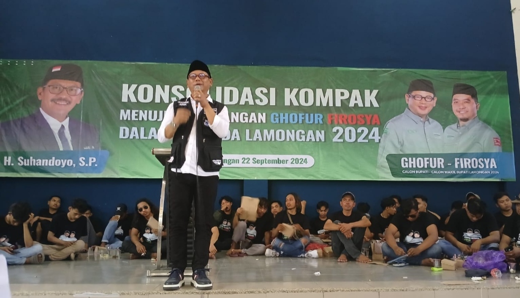 Terimakasih atas kehadiran calon Bupati Lamongan H Abdul Ghofur – Firosya maka kita semua tidak boleh ragu yg hadir di tengah kita kita di sini bangga ada petinggi parta Nasdem yakni Suhandoyo dan Tsalis Fahmi penasehat Partai Gerindra. Lamongan harus segera berubah maju dan makmur. Rakyat harus kita kasih kebebasan untuk memilih jangan ada intimidasi dari manapun.seluruh elemen relawan KOMPAK beranggota 17 ribu dan berbadan hukum bisa hadir semua di acara dalam naungan BAGUS.