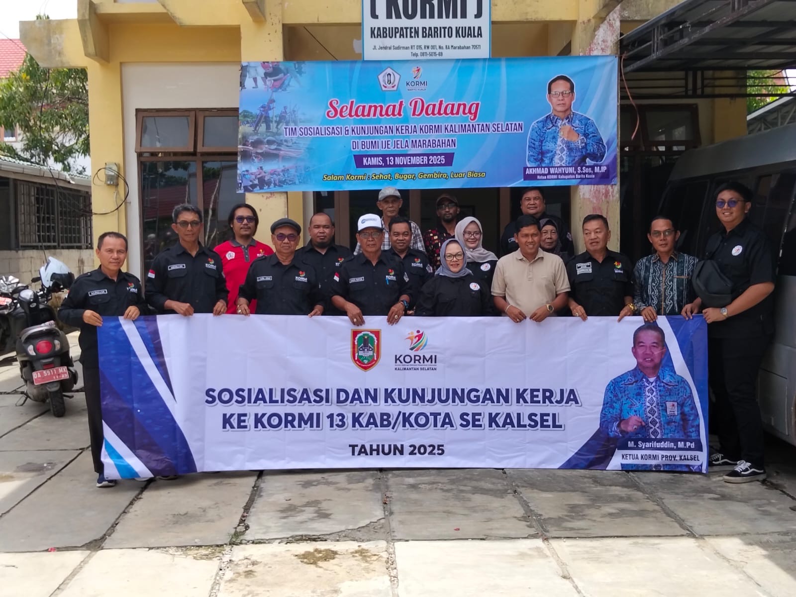 FAKTA – Komite Olahraga Masyarakat Indonesia (KORMI) Kalimantan Selatan (Kalsel) melalui Tim Sosialisasi melakukan kunjungan ke KORMI Kabupaten Barito Kuala (Batola), Kamis (13/11/2025). Kunjungan yang dipimpin Sekretaris KORMI Kalsel, Hj Chairunnisa, diterima Ketua KORMI Batola Akhmad Wahyuni, S.Sos., M.Si beserta jajaran pengurus dan (Induk Organisas Olahrag (inorga) di sekretariat bersama Jalan Sudirman No 8A Marabahan.