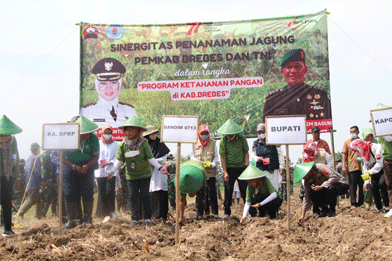 Lebih lanjut Idza mengatakan, bertepatan dengan peringatan HUT ke-77 Kemerdekaan RI tingkat Kabupaten Brebes, Pemkab bersama TNI bersinergi menanam jagung. Dengan melibatkan masyarakat dan kelompok tani menanam jagung di lahan milik TNI seluas ± 11 hektar di Desa Songgom Lor, Kecamatan Songgom.