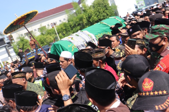 Iring-iringan ribuan petakziah tersebut mengular dari kediaman rumah duka, ke Masjid Al Ittihad hingga ke pemakaman.