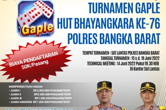 Majalahfakta.id – Meriahkan HUT Bhayangkara ke- 76, Polres Bangka Barat menggelar berbagai perlombaan yang dirangkai dalam kegiatan Kapolres CUP, salah satunya adalah lomba Gaple, yang digelar pada tanggal 15-19 Juni 2022 dengan peserta dari masyarakat umum.