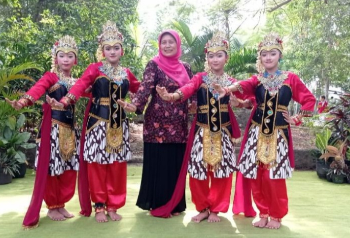 Prihatin Agus Syamsiyah, S.Pd., diapit siswi peserta lomba tari.