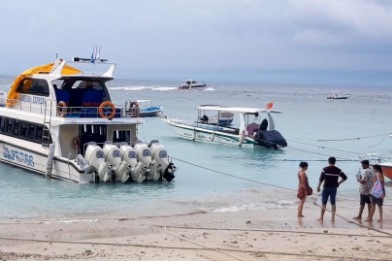 Tepat pukul 08.55 WITA kapal tiba di pelabuhan Nusa Penida, wisatawan disambut hamparan pasir putih.