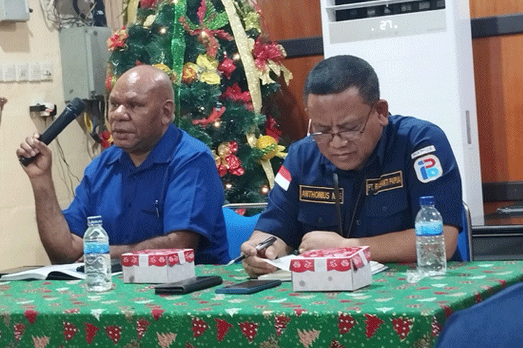 FAKTA – Direktur Umum dan SDM PT. Irian Bhakti Papua Ruben Magai, didampingi Direktur Keuangan Antonius NS memberikan arahan menjelang Nataru kepada para karyawan PT. Irian Bhakti Papua, Rabu (20/12/2023).