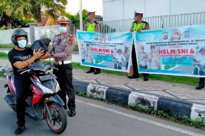 Majalahfakta.id – Satuan Lalu Lintas Polres Lombok Tengah, Polda Nusa Tenggara Barat kembali membagikan helm SNI gratis bagi pengendara dalam rangka menyambut Hari Bhayangkara ke-76.