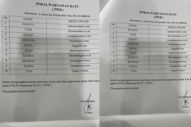 FAKTA – Terkait berita viral beberapa nama perusahan media di Kota Batu, diduga dicatut namanya oleh oknum ‘W’ mengaku wartawan yang mengatasnamakan Pokja Wartawan Batu (PWB) untuk mendapatkan uang tunjangan hari raya (THR). Adapun modus oknum tersebut dengan cara melayangkan surat permohonan ke sejumlah instansi pemerintahan dan kepala desa di wilayah Kota Batu, Provinsi Jawa Timur.