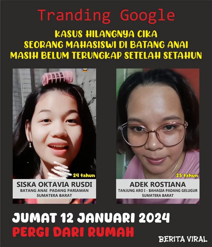 “Pada Jumat 12 Januari 2024 sekitar pukul 09.00 WIB, setelah Cika mencuci motornya, ia pergi sendiri menemui cowoknya. Karena ban motor yang dikendarai Cika kempes, Cika menyuruh cowoknya menjemput temannya itu Adek Rostiana. yang akrab disapa Adek. Hingga malamnya Cika bersama Adek tidak kembali ke rumah,” sebut orang tua Cika, Nila Yusnita.