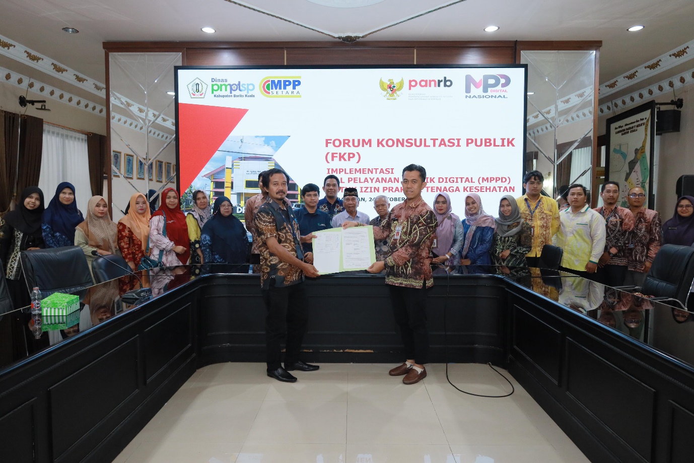 FAKTA – Pemerintah Kabupaten Barito Kuala melalui Dinas Penanaman Modal dan Pelayanan Satu Pintu (DPMPTSP) bersama Dinas Kesehatan Barito Kuala melaksanakan acara Forum Konsultasi Publik (FKP) terkait Implementasi Mal Pelayanan Publik Digital (MPPD) untuk Izin Praktek Tenaga Kesehatan.