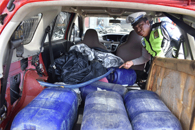 “Awalnya Mobil tersebut diberhentikan karena melanggar peraturan lalulintas dengan tidak menggunakan plat nomor atau TNKB, pada saat di periksa ke bagian dalam mobil terdapat selanh yang dihubungkan ke beberapa jerigen didalam mobil,” jelasnya.