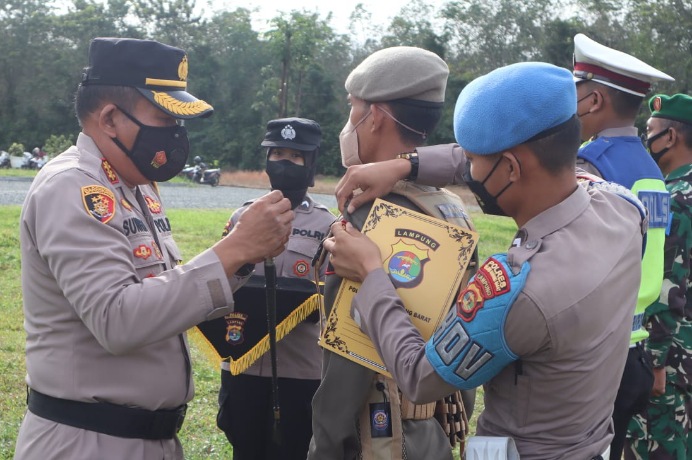 “Terciptanya kamseltibcarlantas yang aman dan kondusif pasca pandemi Covid 19 saat ini, tentunya memerlukan upaya kerja keras kita dengan tetap mematuhi protokol kesehatan yang berlaku, walaupun telah dilonggarkan oleh pemerintah,” ujar Kapolres membacakan amanat Kapolda Lampung.