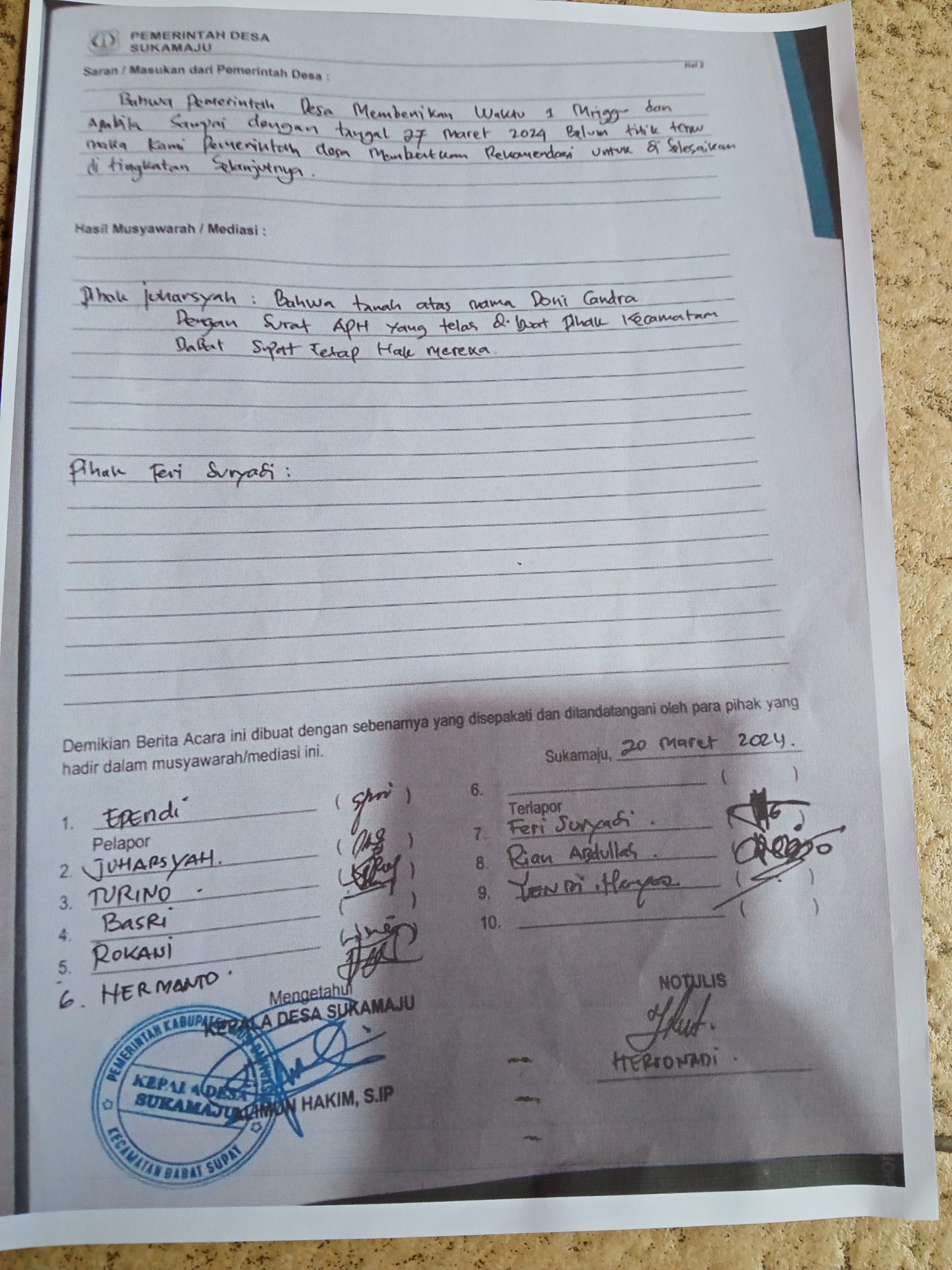 Untuk mendapatkan keterangan keabsahan kedua surat tersebut Media Fakta pada hari Senin, 3 Juni 2024, jam 10 30, tim kuasa dari JHR, mendatangi Lurah Suka Maju, Lukman Nul Hakim, S.IP., di ruang kerjanya, mengatakan, “Didalam permasalahan ini saya berusaha untuk memberikan msdiasi antara pemilik SPHT dan pemilik Surat Segel, di kantor ini, sebanyak tiga kali namun tidak ada hasil nya, sama-sama mereka mengklaim dia yang paling benar, dan saya disini tidak dapat mengatakan dari salah satu mereka yang benar, karena saya bukan untuk mengadili tapi menyelesaikan secara mufakat dan musyawarah , namun tidak berhasil, yah, silahkan tempuh jalan pengadilan, apa lagi JRH, punya surat lengkap bawa saja kepengadilan, nanti disana akan didapat keputusan yang valid,” ujarnya.