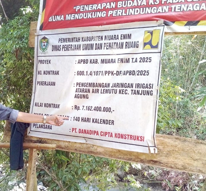 Kepala Dinas PUPR Suhermansyah, S.T., M.eng CGCAE , majalah fakta mencoba konfirmasi terkait anggaran proyek proyek dimaksud yakni pengembangan Jaringan Irigasi Ataran Air Lemutu di Tanjung Agung pada Dinas PUPR Muara Enim dengan nilai kontrak mencapai Rp7 miliar. Belum bisa ditemui dan Kabid Pengairan Ibu Echi lagi ke Palembang kata salah satu ASN Dinas PUPR Kabupaten Muara Enim,