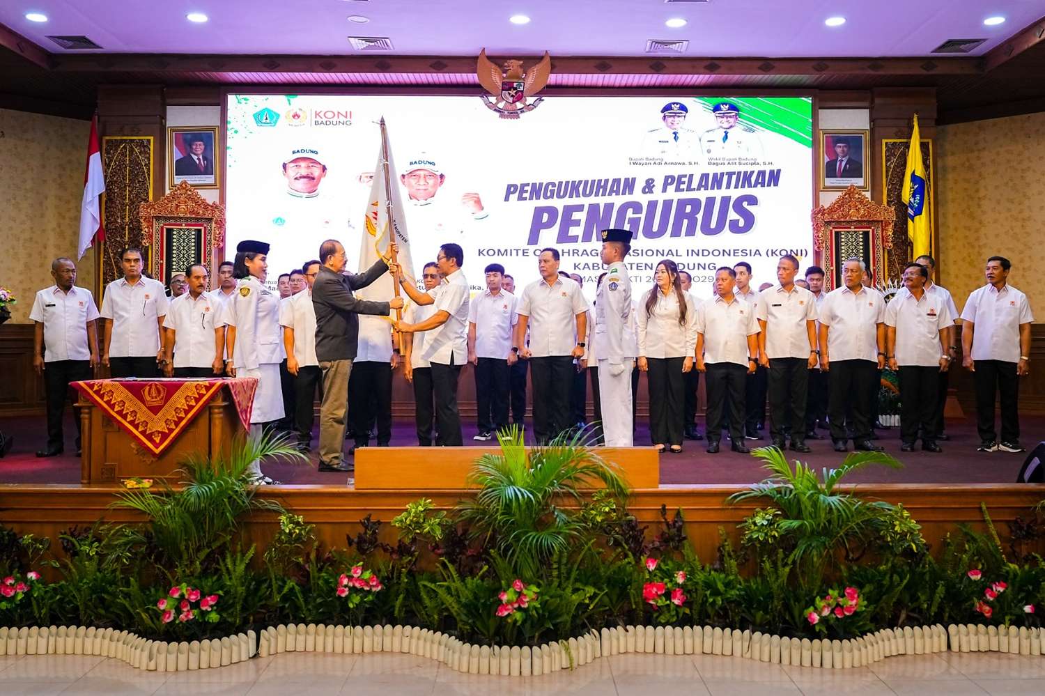 FAKTA – Pengurus Komite Olahraga Nasional Indonesia (KONI) Kabupaten Badung masa bakti tahun 2025-2029 secara resmi dikukuhkan dan dilantik oleh Ketua Umum KONI Bali I Gusti Ngurah Oka Darmawan di Puspem Badung, Rabu (18/2/2026). I Made Sutama dikukuhkan sebagai Ketua Umum KONI Badung. Acara pelantikan dihadiri Bupati Badung I Wayan Adi Arnawa, Ketua DPRD Badung diwakili anggota Komisi IV DPRD Badung I Gede Suraharja, Ketua KONI Kabupaten/Kota se-Bali serta Pimpinan Cabang Olahraga.