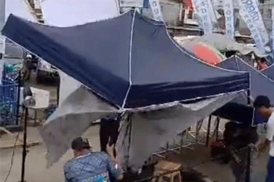 Akibatnya, sejumlah tenda terbang karena tertiup angin dan salah satunya tenda itu mengena salah satu mobil milik polisi yang mengamankan acara pembukaan tersebut.