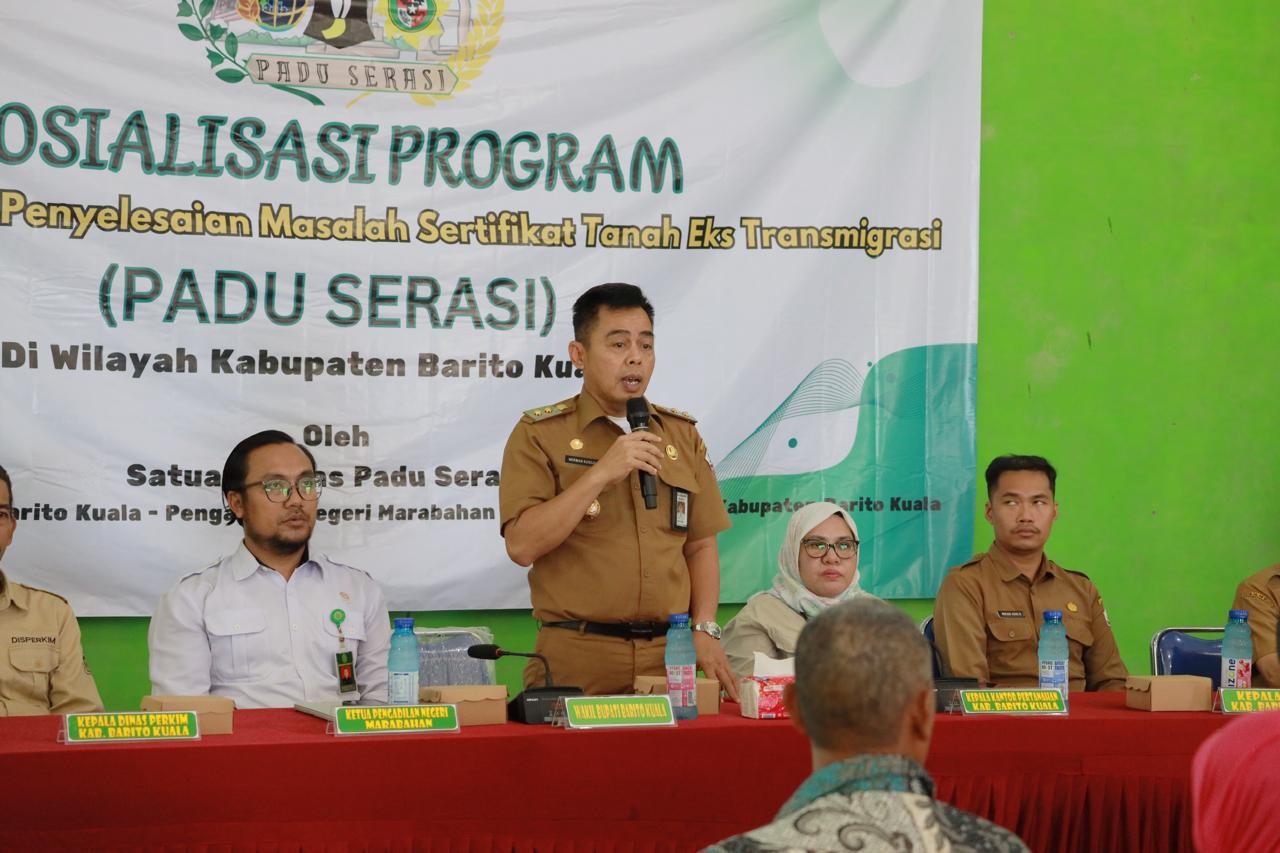 FAKTA – Pemerintah Kabupaten (Pemkab) Barito Kuala (Batola) melalui Pengadilan Negeri (PN) Marabahan, Dinas Perumahan Rakyat dan Kawasan Permukiman (Disperkim), serta Kantor Pertanahan melaksanakan Sosialisasi Program Pelayanan Terpadu Penyelesaian Masalah Sertifikat Tanah Eks Transmigrasi (Padu Serasi) di wilayah Kabupaten Barito Kuala.