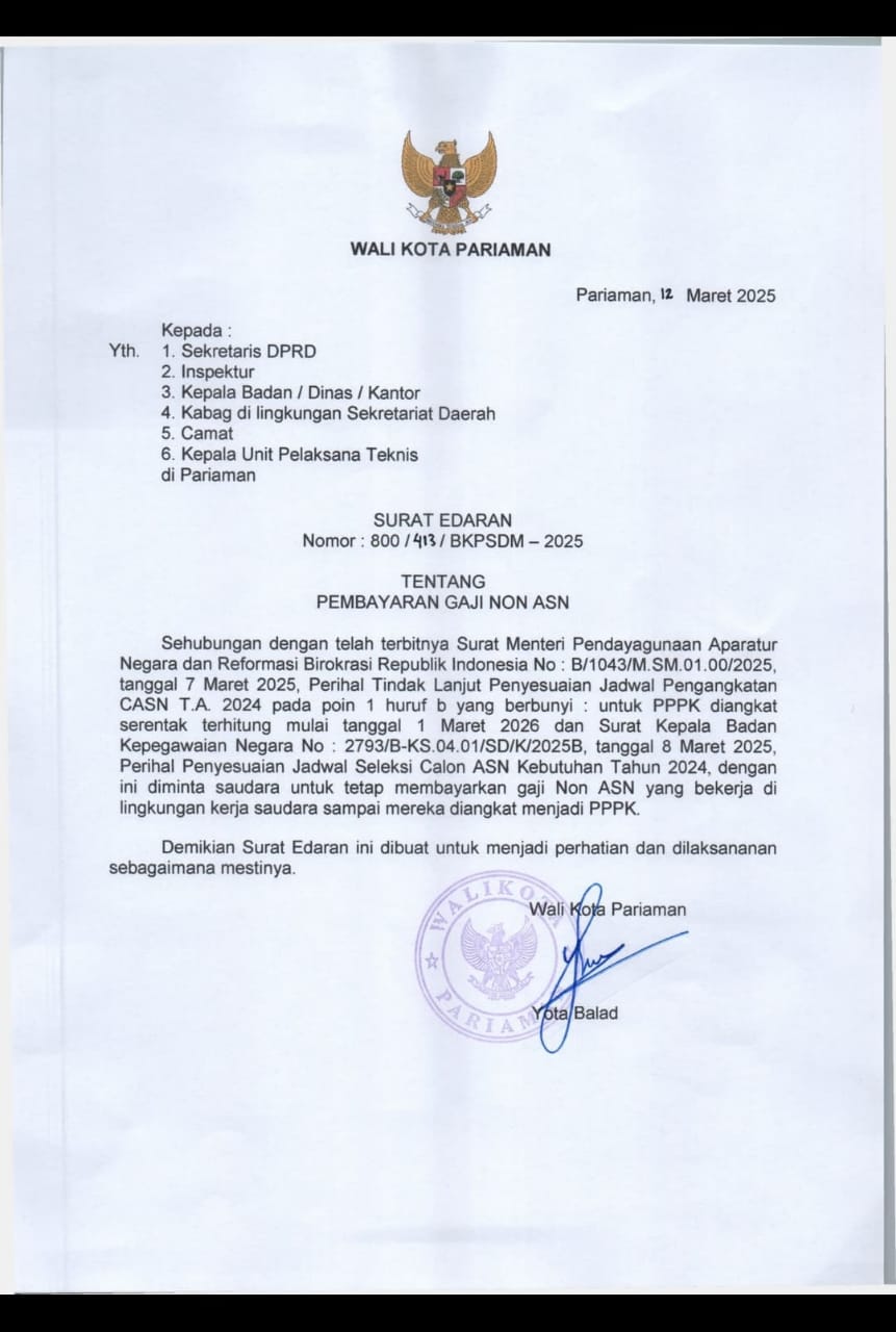 FAKTA — Pemerintah Kota Pariaman, Sumatera Barat, resmi menerbitkan Surat Edaran (SE) Nomor 800/413/BKPSDM-2025 tentang Pembayaran Gaji Non-Aparatur Sipil Negara (Non-ASN).