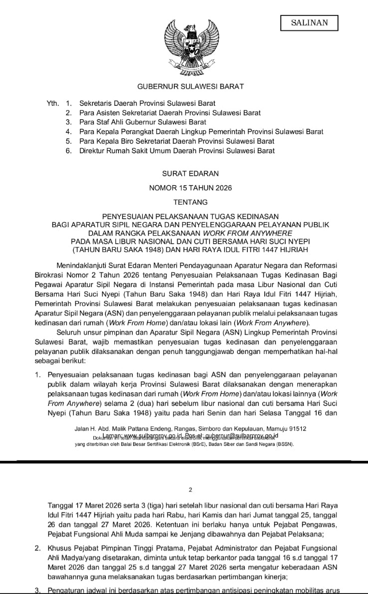 Dalam surat edaran tersebut dijelaskan bahwa pelaksanaan WFH dan WFA bagi ASN lingkup Pemerintah Provinsi Sulawesi Barat diterapkan selama dua hari sebelum libur nasional Nyepi, yakni pada 16 dan 17 Maret 2026, serta tiga hari setelah libur Idul Fitri, yaitu 25, 26, dan 27 Maret 2026.