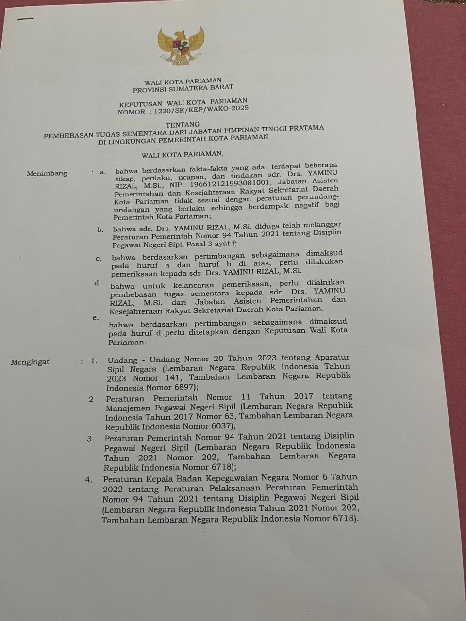 FAKTA – Mantan Asisten Pemerintahan dan Kesejahteraan Rakyat Sekretariat Daerah Kota Pariaman, Yaminu Rizal, yang diduga melanggar Peraturan Pemerintah (PP) Nomor 94 Tahun 2021 tentang Disiplin Pegawai Negeri Sipil, resmi menggugat Surat Keputusan (SK) Wali Kota tentang pembebasan tugas sementara dari jabatan Pimpinan Tinggi Pratama ke Pengadilan Tata Usaha Negara (PTUN) Padang.
