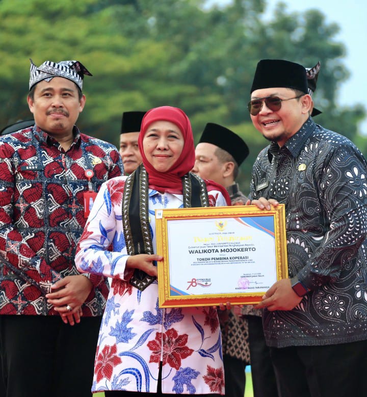 FAKTA – Gubernur Jawa Timur Khofifah Indar Parawansa memberikan penghargaan kepada Wali Kota Mojokerto, Ika Puspitasari, dipuncak Peringatan Hari Koperasi ke-78 yang digelar di Stadion Letjen H Sudirman, Bojonegoro pada Kamis (17/7/2025).