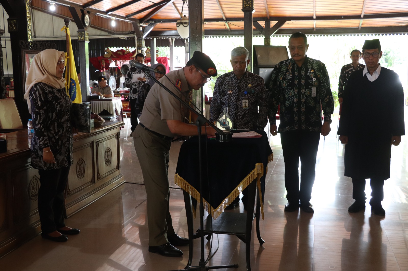 Turut hadir dalam pengambilan sumpah, perwakilan Forkopimda, anggota DPRD, sejumlah Kepala OPD di lingkungan Pemkab Brebes, Camat, dan kepala desa penlok, serta para pegawai BPN kabupaten Brebes, dan para tamu undangan lainnya. (dun)