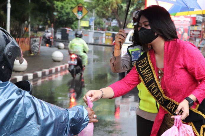 Peringati Hari Kartini, Polwan Polres Batu Kenakan Kebaya saat Bagikan Takjil