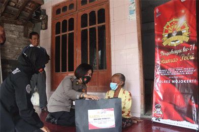 Dalam pelaksanaannya, Kasi Humas Polres Mojokerto Iptu Tri Hidayati bersama anggota didampingi Bhabinkamtibmas Desa Menanggal, terjun langsung secara door to door ke beberapa rumah lansia untuk menyerahkan bantuan sosial berupa paket sembako.