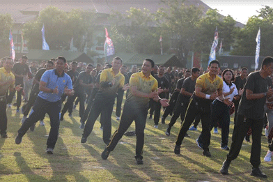 FAKTA – Menjelang Peringatan Hari Bhayangkara ke-77 dan HUT Kodam IX/Udayana ke-66 tahun, Polda Bali, Kodam IX/Udayana dan Forkopimda Provinsi Bali menggelar olahraga bersama di Lapangan Praja Raksaka, Kepaon, Denpasar, Selasa (13/6/2023).