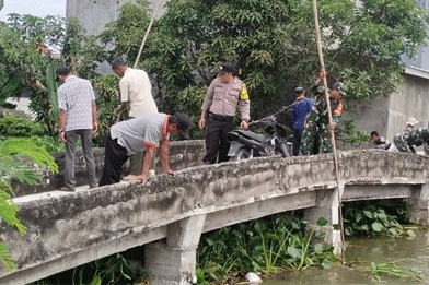 Permukaan sungai yang selalu tertutup tanaman enceng gondok Saat musim penghujan dikawatirkan menyebabkan banjir sehingga dilakukan pembersihan oleh anggota Koramil 0812/02 Deket dan Masyarakat sekitar. Kamis (23/02/2023).
