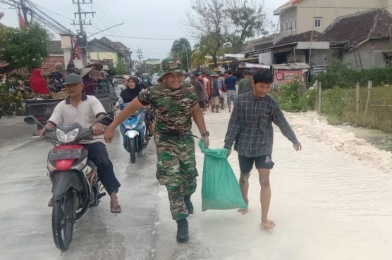Anggota Koramil 0812/15 Karanggeneng bersama perangkat desa serta masyarakat melaksanakan kegiatan kerja bakti penyekatan air dengan pedel di Jalan Desa Sungelebak Kecamatan Karanggeneng.