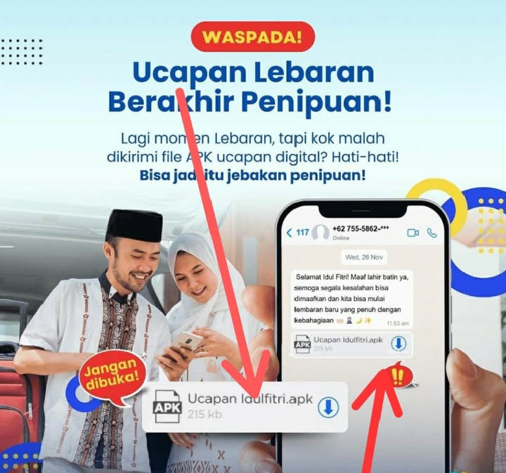 ” Bila menerima Ucapan Idul Fitri Digital dalam bentuk File APK (Android Package Kit) dari nomor tidak dikenal via WA / SMS / Email abaikan saja dan segera hapus. Jangan di klik atau membuka file APK tersebut karena berakibat data pribadi dll hilang / di curi secara digital oleh pihak lain yang disebut Phising (Penipuan online berakibat hilangnya data pribadi).”