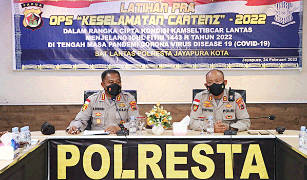 Majalahfakta.id – Polresta Jayapura Kota – Bertempat di Aula Mapolresta Jayapura telah dilakasanakan Latihan Pra Operasi Keselamatan Cartenz 2022 yang dipimpin langsung Kapolresta Jayapura Kota Kombes Pol. Gustav R. Urbinas, SH., S.IK., M.Pd didampingi Wakapolresta AKBP Supraptono, S.Sos., M.Si. Sabtu (26/2) pagi.