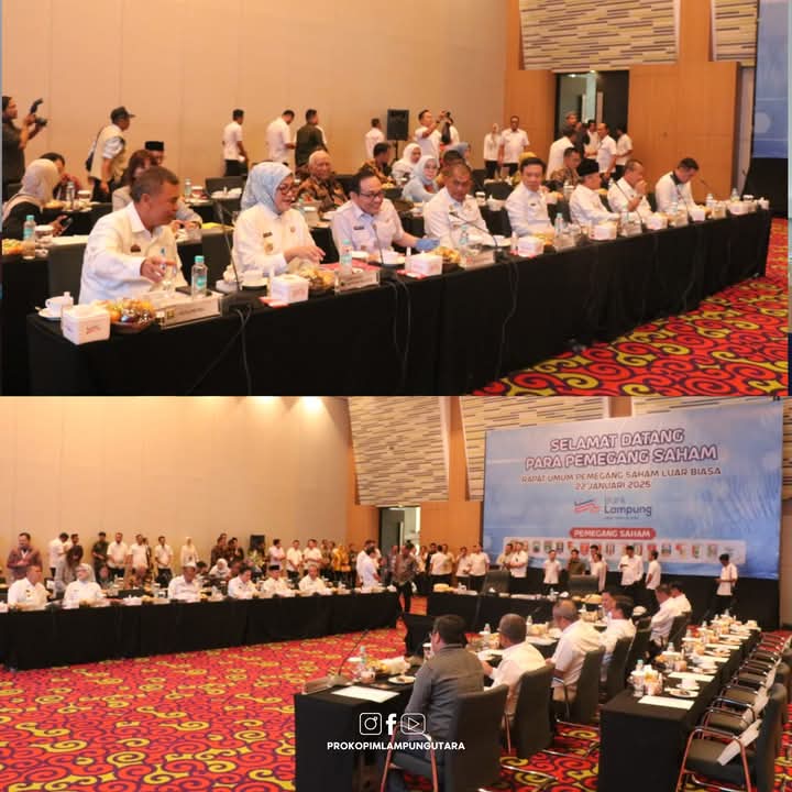 FAKTA – Penjabat Bupati Lampung Utara, Drs. H. Aswarodi, M.Si., bersama para Kepala Daerah se-Provinsi Lampung menghadiri Rapat Umum Pemegang Saham Luar Biasa (RUPS-LB) PT. Bank Lampung yang berlangsung di Ballroom Hotel Novotel, Bandar Lampung, Rabu (22/1/2025).
