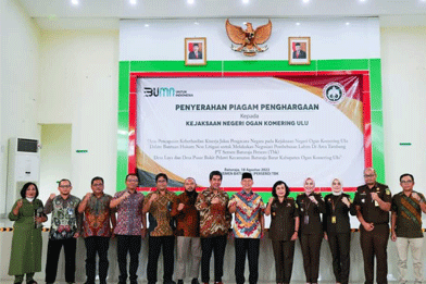 Penyerahan piagam penghargaan kepada Kejaksaan Negeri OKU, atas pencapaian keberhasilan kinerja jaksa pengacara Negara pada Kejaksaan Negeri OKU, dalam bantuan Hukum Non Litigasi untuk melakukan negosiasi pembebasan lahan di area tambang PT. Semen Baturaja Persero (Tbk) Desa Laya dan Desa Pusar Bukit Pelawi Kecamatan Baturaja Barat Kabupaten OKU.