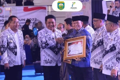 Puncak peringatan HUT ke-77.PGRI dan HGN, Gubernur Sumsel H. Herman Deru mendapatkan penghargaan dari PGRI Sumsel.