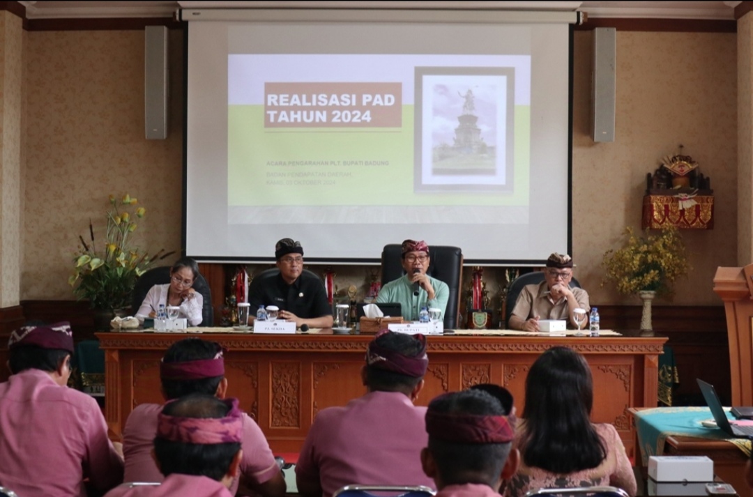 Dalam rangka mengevaluasi hasil capaian penerimaan Pendapatan Asli Daerah (PAD) sampai dengan semester II Tahun 2024 dan persiapan pembahasan Induk APBD Kabupaten Badung Tahun Anggaran 2025, Plt. Bupati Badung I Ketut Suiasa didampingi Pj. Sekda Badung IB. Surya Suamba melaksanakan Rapat Koordinasi dan Evaluasi Pendapatan Asli Daerah bersama Kepala Badan Pendapatan Daerah Kab. Badung Ni Putu Sukarini beserta jajarannya di Ruang Pertemuan Bapenda Badung, Puspem Badung, Kamis (3/10/2024).Hadir pula mendampingi Plt. Bupati Badung, Inspektur Kab. Badung Luh Suryaniti, Ka. Bappeda I Made Wira Dharmajaya, Kabag Prokompim I Made Suardita.