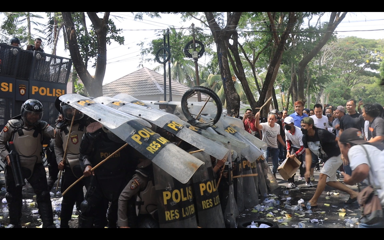 “Tahapan pertama situasi bendera hijau situasi massa masih bisa dikendalikan dengan dalmas awal dan melakukan negosiasi dengan tim negisiator, situasi bendera kuning massa mulai anarkis personil dalmas awal melakukannya lintas ganti dengan dalmas lanjut dan situasi bendera bendera merah massa semakin brutal melakukan pelemparan, pengerusakan dan pembakaran pasukan dalmas lanjut lintas ganti dengan pasukan PHH Brimob dan dalmas lanjut melakukan penebalan,” tegasnya.