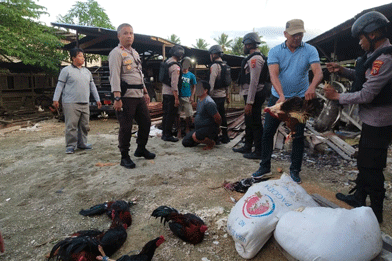 “Saat mendatangi TKP beberapa orang sempat melarikan diri namun kami berhasil mengamankan tiga orang termasuk pemilik lokasi. Barang bukti yang berhasil diamankan diantaranya, 14 ekor Ayam Jantan (Ayam Adu), dua buah Pisau Tajih, lima unit SPM berbagai merk, satu Mobil Daihatsu Grandmax dan Uang Tunai sebesar 710 ribu rupiah,” terangnya.