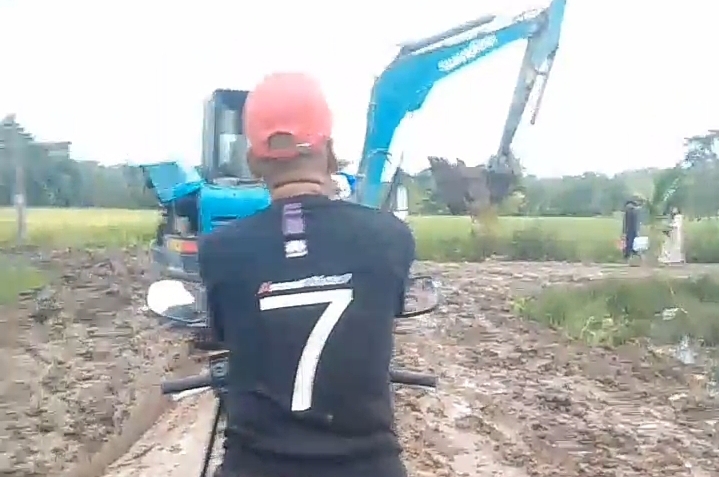 Terlihat sebuah alat berat jenis excavator menimbun badan jalan menggunakan tanah becek bercampur lumpur.