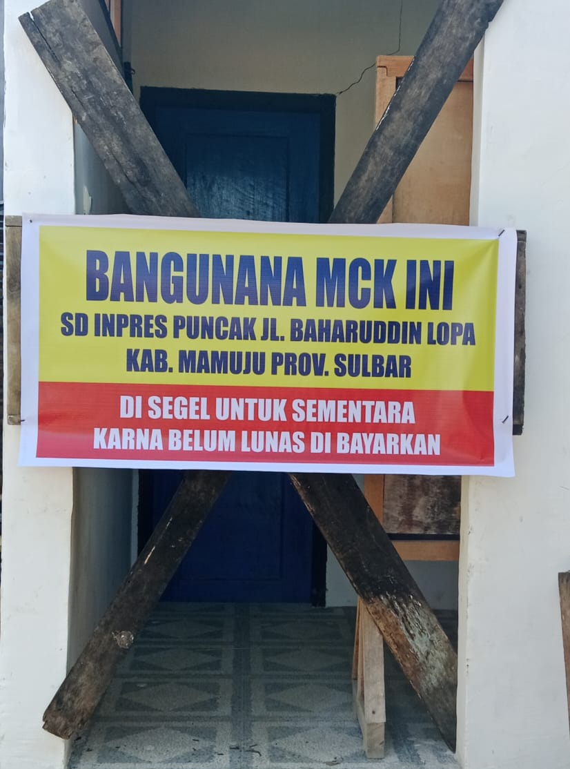 Penyegelan ini diduga karena pembayaran material dan upah kerja belum dibayar lunas oleh kontraktor, selaku pihak yang menandatangani perjanjian kerjasama dengan pihak pekerja dalam proyek pembangunan MCK SD Inpres Puncak Mamuju.