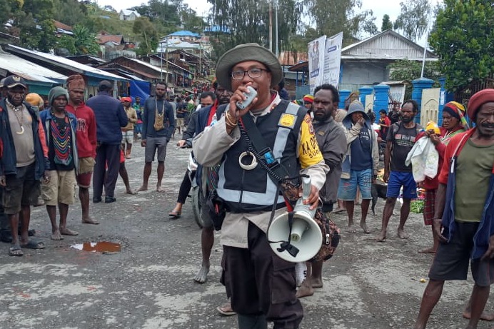 Majalahfakta.id – Satgasres Binmas Operasi Damai Cartenz-2022 yang dipimpin oleh Ipda Angel Mayor didampingi oleh bapak Michelle Sondegau ajak turun ke Pasar pagi Yokattapa Sugapa jalan-jalan sambil menyampaikan pesan-pesan Kamtibmas dan berdialog dengan para penjual dan pembeli di pasar pagi Yokatapa Sugapa untuk mengetahui situasi dan kondisi pasar pagi Yokatapa Sugapa, Selasa (31/05/22).
