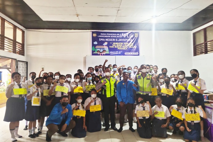 FAKTA – Satuan Lalulintas Polresta Jayapura Kota berikan Penyuluhan tertib berlalulintas kepada para pelajar dalam rangka Masa Pengenalan Lingkungan Sekolah (MPLS) di dua sekolah.