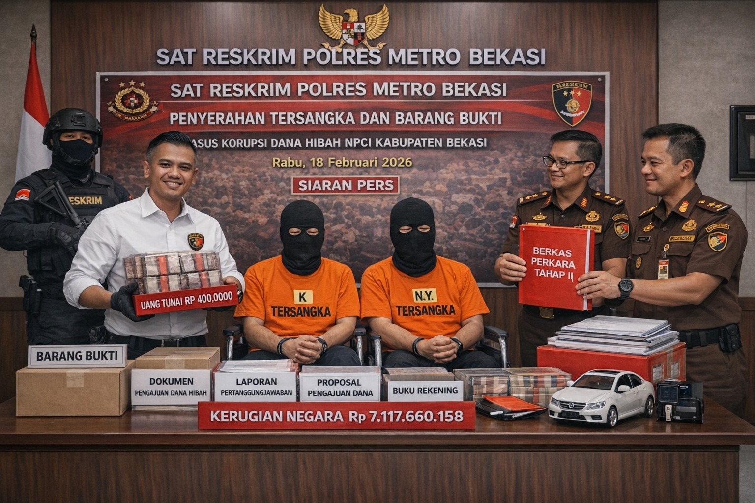 FAKTA – Satuan Reserse Kriminal Polres Metro Bekasi, jajaran Polda Metro Jaya, melaksanakan penyerahan tersangka dan barang bukti (Tahap II) dalam perkara dugaan tindak pidana korupsi penyalahgunaan dana hibah yang bersumber dari APBD dan APBD Perubahan Kabupaten Bekasi Tahun Anggaran 2024 untuk kegiatan National Paralympic Committee Indonesia (NPCI) Kabupaten Bekasi pada Rabu (18/2/2026).