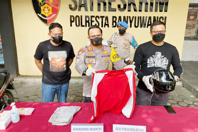 Kombes Pol Deddy menjelaskan kronologis kejadian berawal dari pelapor RM (18 tahun), seorang mahasiswi di salah satu perguruan tinggi pada hari Rabu tanggal 13 Juli 2022 sekitar pukul 17.00 WIB, RM sedang menunggu temannya di Taman Sritanjung depan Pendopo Sabha Swagatha Blambangan. Dan sekira pukul 17.22 WIB, RM melihat ada seorang laki– laki dengan ciri-ciri menggunakan celana pendek warna coklat susu dan kaos olahraga lengan panjang warna merah kombinasi putih dengan mengendarai sepeda motor Honda Supra Fit, Warna Hitam, No.Pol. DK-5321-XT.
