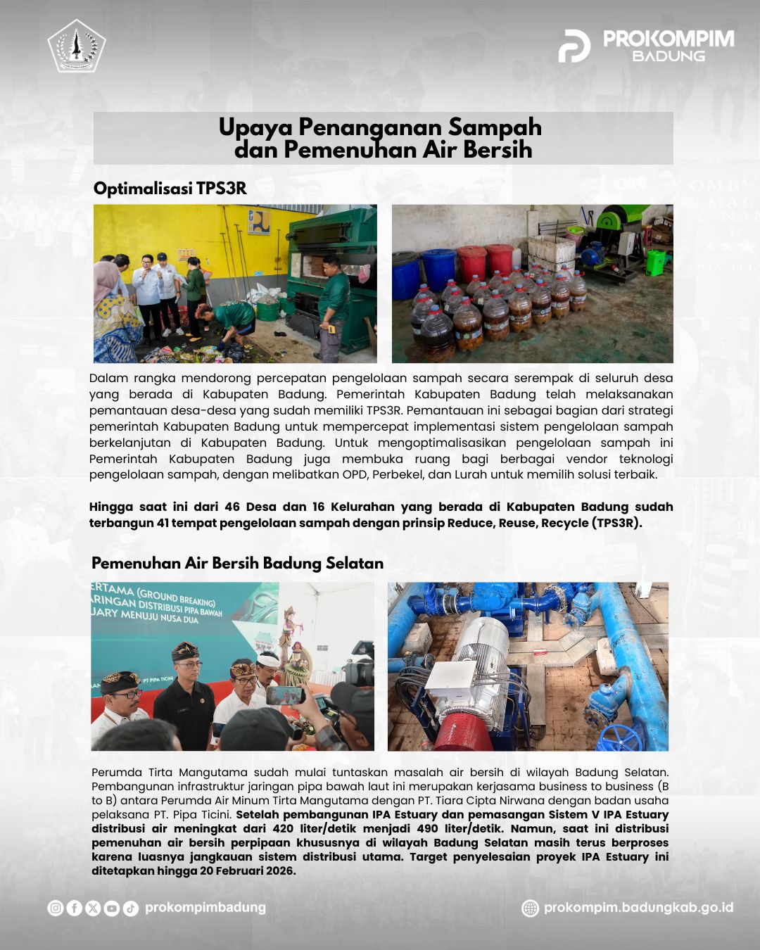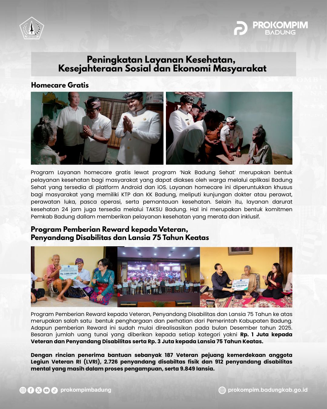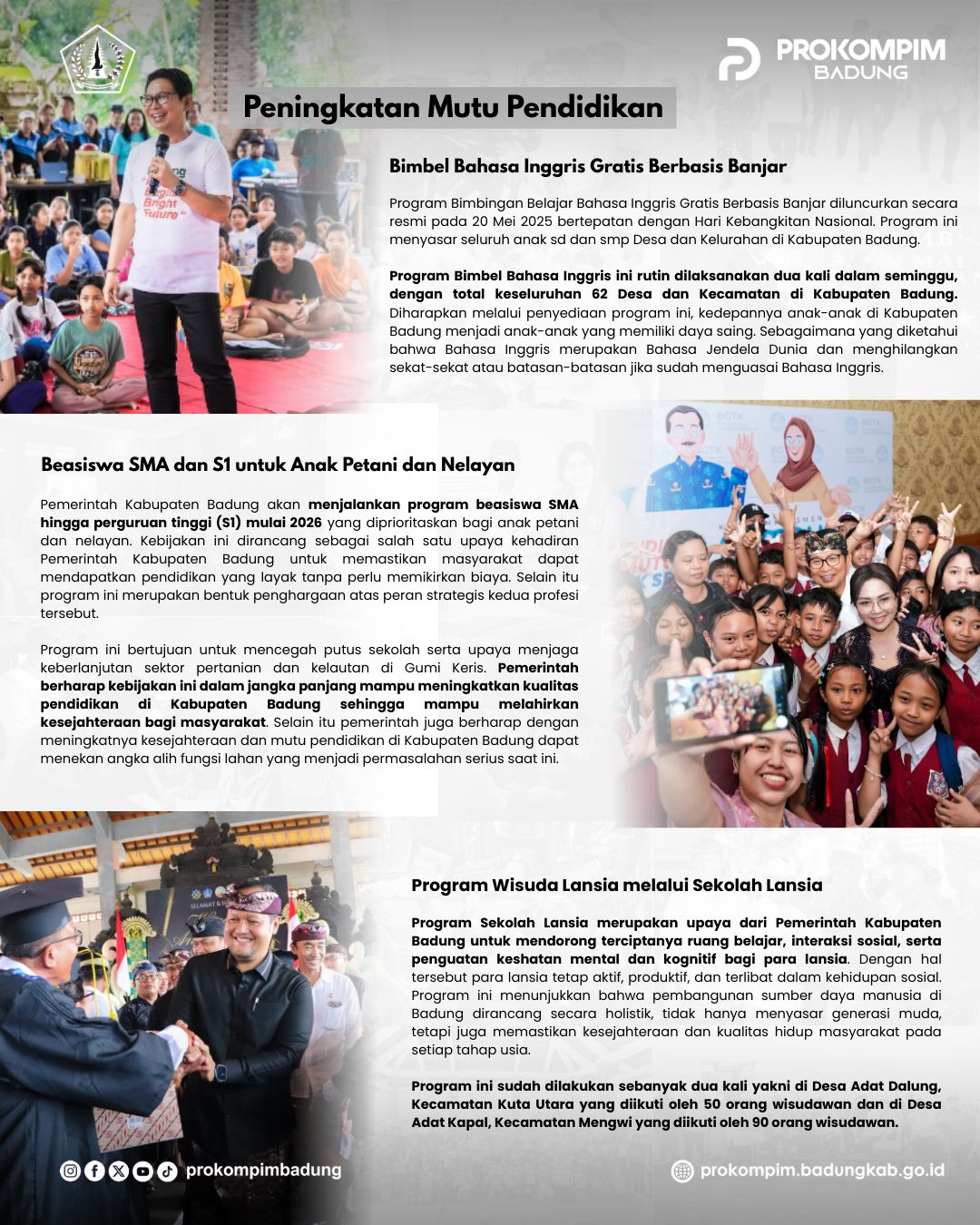 Isu lingkungan dijawab melalui bersih pantai berkelanjutan, serta peningkatan kapasitas distribusi air bersih ke Badung Selatan. Di sisi lain, komitmen terhadap kualitas SDM diwujudkan lewat bimbel Bahasa Inggris gratis berbasis banjar, beasiswa bagi anak petani dan nelayan, layanan homecare “Nak Badung Sehat”, dukungan kegiatan olahraga, serta penguatan perlindungan sosial bagi veteran, disabilitas, dan lansia.