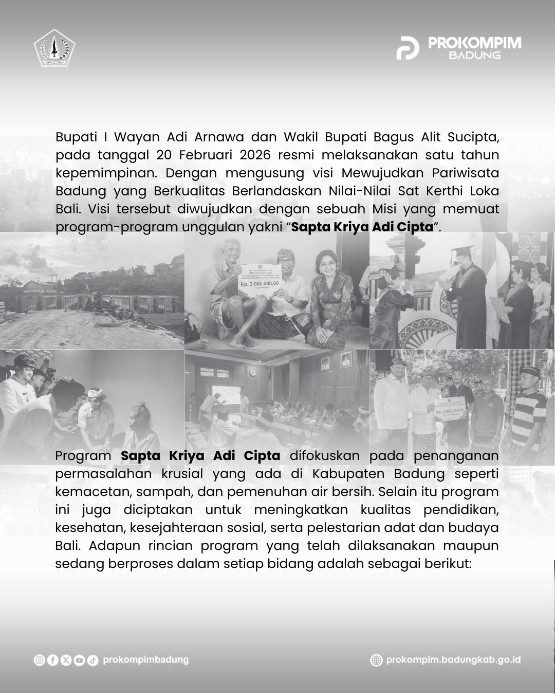 FAKTA – Satu tahun kepemimpinan Bupati Badung I Wayan Adi Arnawa dan Wakil Bupati Badung Bagus Alit Sucipta bukan sekadar penanda waktu, tetapi fase awal pembuktian arah pembangunan melalui Sapta Kriya Adi Cipta.