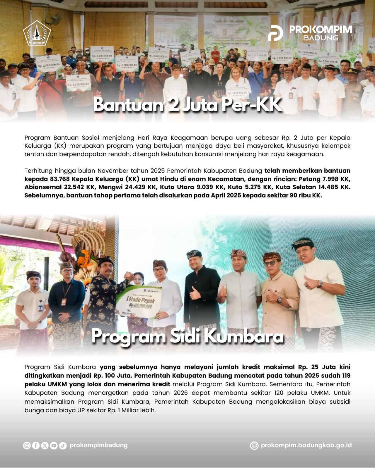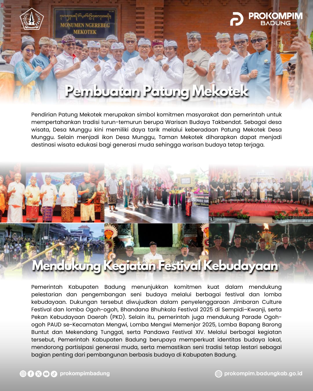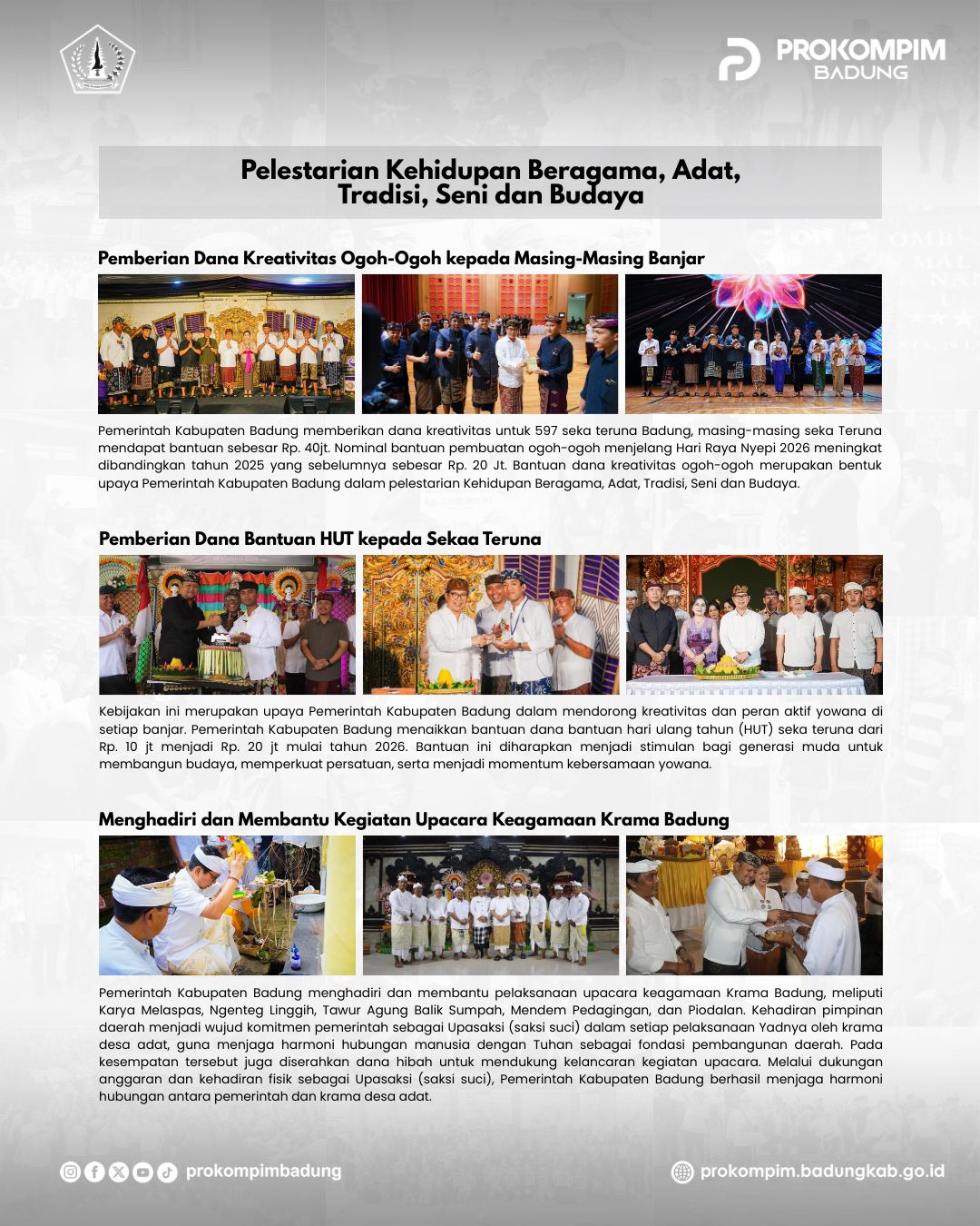 Pelestarian adat dan budaya tetap menjadi fondasi mulai dari dukungan dana kreativitas ogoh-ogoh, pengembangan desa wisata, hingga festival budaya yang memperkuat identitas Bali di tengah arus globalisasi. Selain itu penghargaan kepada yang tertib administrasi kependudukan akta kematian.