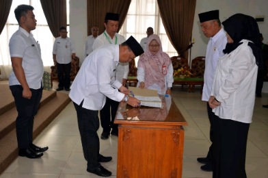 FAKTA – Pj. Bupati Barito Kuala, Mujiyat, S.Sn. M.Pd., melaksanakan pelantikan Pejabat Fungsional lingkup Pemerintahan Kabupaten Barito Kuala (Batola) untuk Formasi Tahun 2019 di aula Selidah pada Rabu (21/6/2023) dihadiri oleh Sekretaris Daerah (Sekda), Kepala Badan Kepegawaian Daerah (BKD), dan saksi dari Kepala Dinas Kesehatan dan Kepala Dinas Pendidikan Kabupaten Barito Kuala.