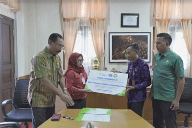 Kadis Perindustrian dan Tenaga Kerja Badung I Putu Eka Merthawan bersama Kepala Kantor BPJS Ketenagakerjaan Cabang Badung Nurul Indahyati menyerahkan secara simbolis Kartu BPJS Ketenagakerjaan bertempat di Ruang Rapat Camat Abiansemal.