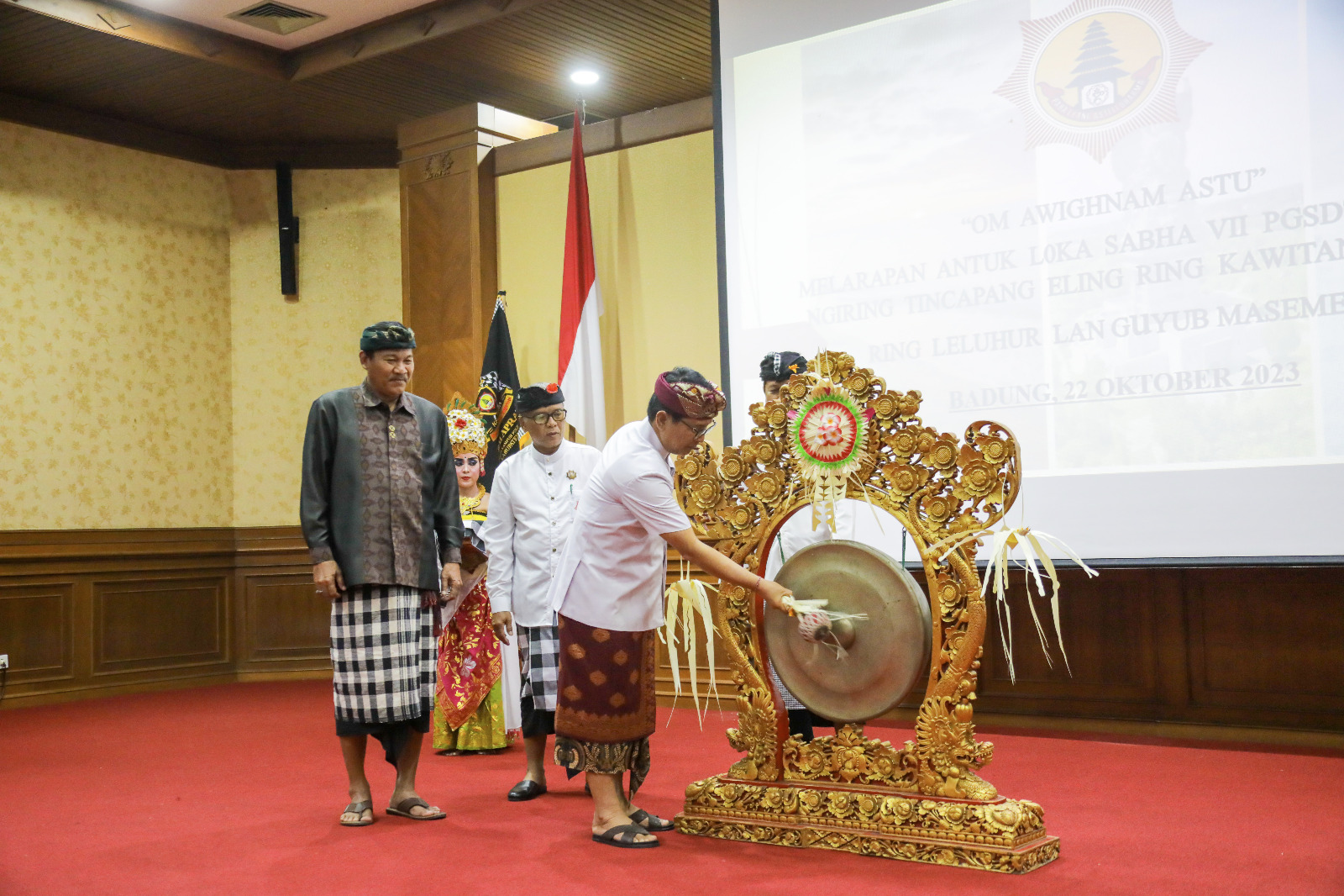 FAKTA, BADUNG – Mewakili Bupati, Sekretaris Daerah Kabupaten Badung I Wayan Adi Arnawa menghadiri sekaligus membuka Lokasabha VII Para Gotra Sentana Dalem Tarukan (PGSDT) Kabupaten Badung dengan tema “Ngiring Tincapang Eling Ring Kawitan, Bhakti Ring Leluhur lan Guyub Masemeton” yang ditandai dengan pemukulan Gong, bertempat di gedung bertempat Kertha Gosana Puspem Badung, Minggu (22/10).