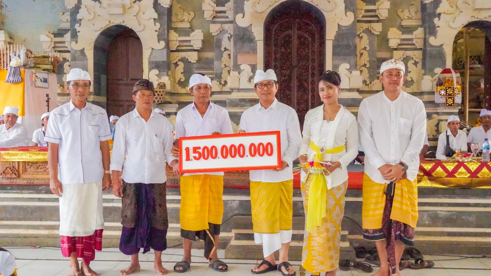 Sebagai bentuk perhatian dan komitmen pemerintah, Sekda Adi Arnawa menyerahkan bantuan dana hibah Upakara secara simbolis sebesar Rp1,5 miliar serta bantuan dana dari perbekel Desa Belok/Sidan sebesar Rp100 juta dan bantuan dana pribadi dari anggota DPRD Badung lGAA lnda Trimafo Yudha sebesar Rp5 juta yang diterima Manggala Karya Wayan Mudiasa disaksikan langsung oleh seluruh pemedek.